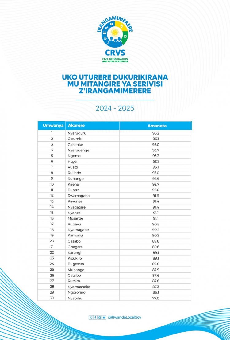 Minisiteri y'ubutegetsi bw'iguhugu Minaloc, yashyize hanze urutonde rw'uturere uko turutanwa mu mitangire ya Services z'irangamimirere mu mwaka wa 2024- 2025 maze akarere ka Nyabihu aba ariko kaza ku mwanya wanyuma n'amanota 77.0, ni mugihe akarere ka mbere kabaye Nyaruguru namanota 96.2