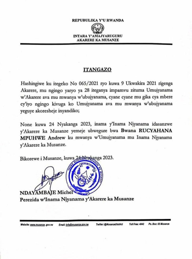Uwahoze ari Visi Meya wa Musanze Ushinzwe Ubukungu Andrew Rucyahana Mpuhwe, umwe mu bitabiriye ibirori byo kwimika Umutware w'Amakono yeguye ku mirimo ye.