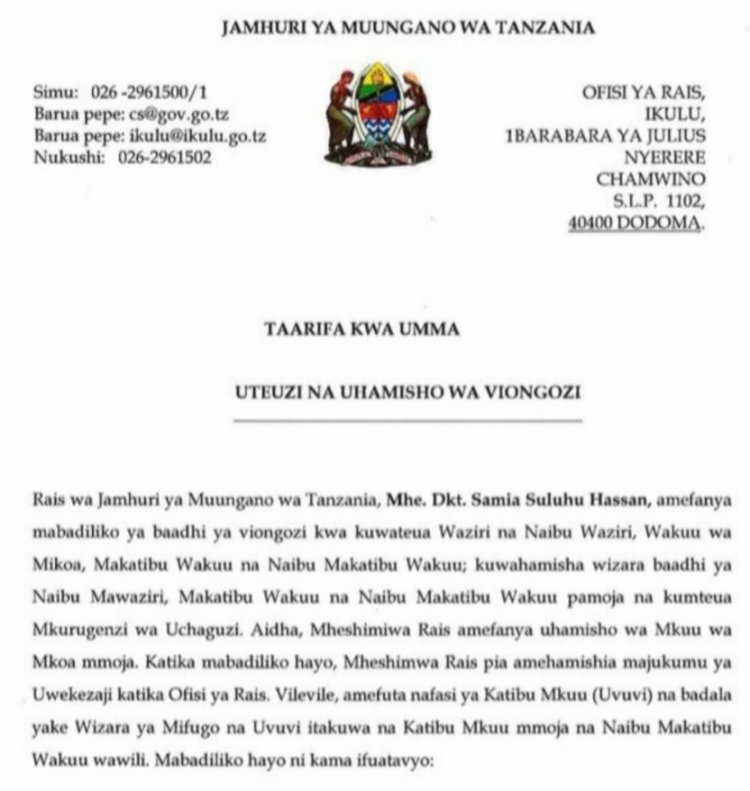 Itangazo ryaturutse mu biro by'Umukuru w'Igihugu, rirerekana uburyo Perezida Samia yakoze impinduka cyane mu banyamabanga ba leta ndetse n'abakuru bi Intara.