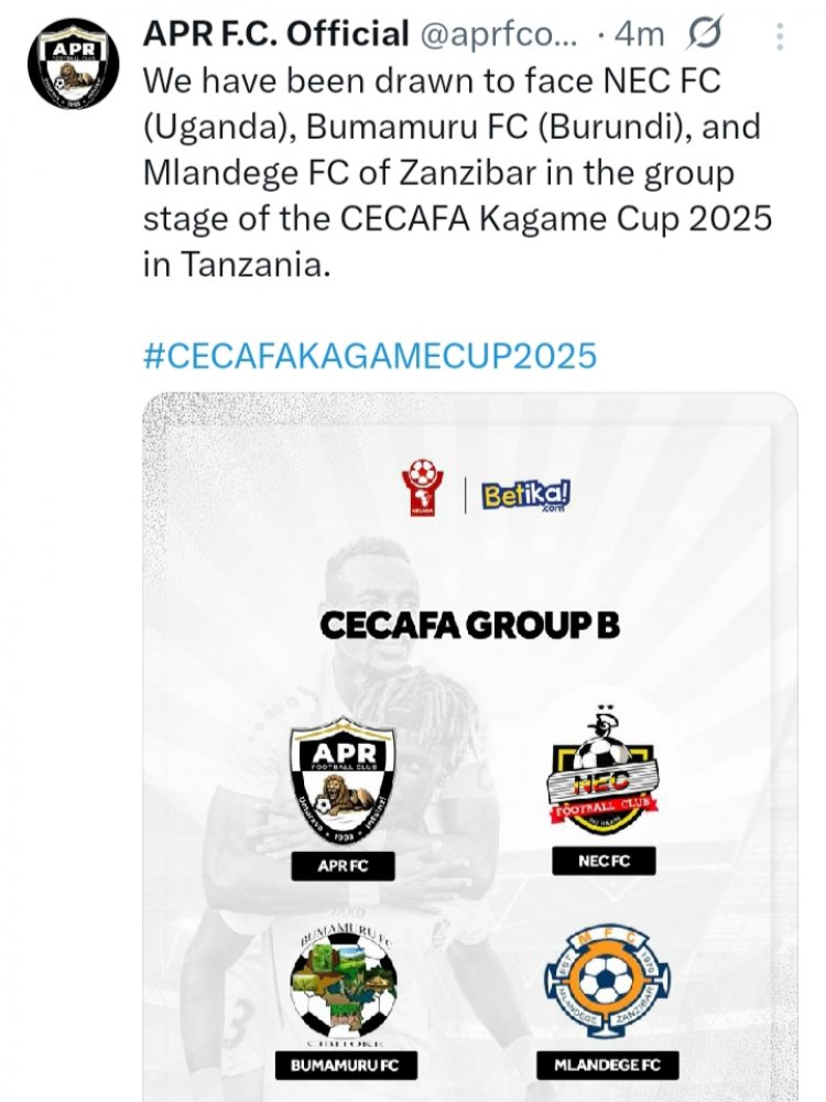 Zikiwa zimesalia siku chache kabla ya kuanza kwa mashindano ya CECAFA Kagame Cup ya mwaka 2025 – mashindano yanayowakutanisha vilabu kutoka Afrika Mashariki na Kati – timu ya jeshi la Rwanda, APR FC, imepangwa kwenye Kundi B.