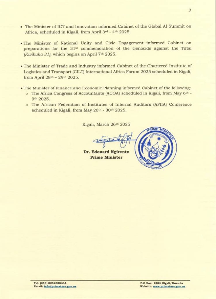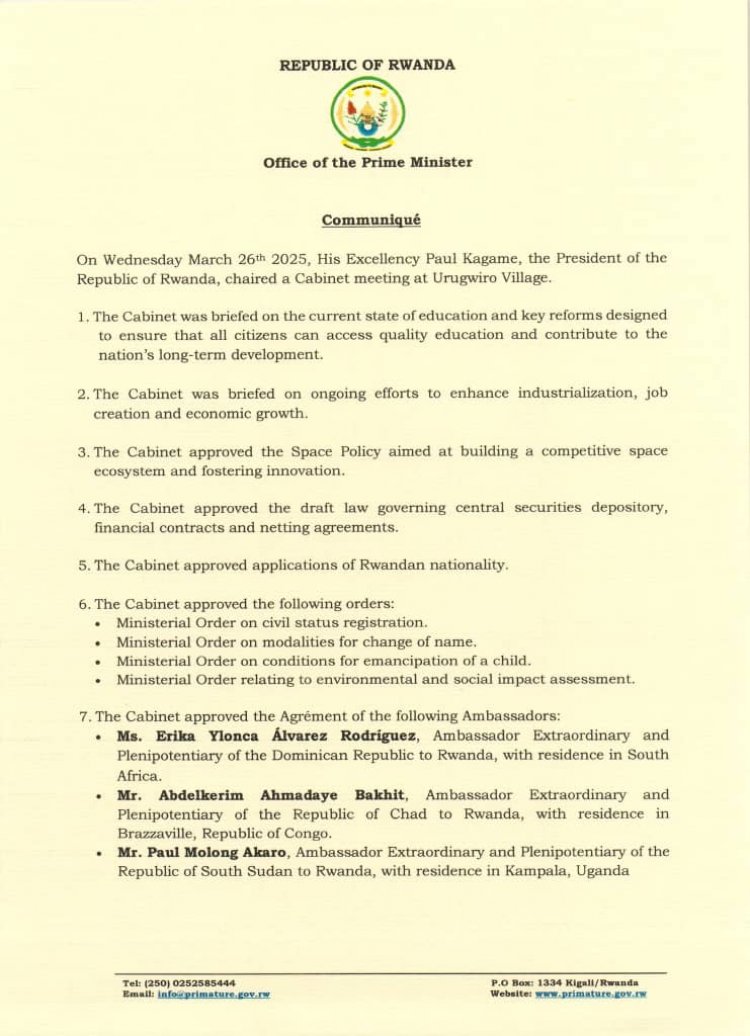 Inama y'abaministri yateranye kuri uyu wa gatatu Tariki ya 26 Werurwe 2025 yemeje ko Col Pacifique Kayigamba Kabanda nk'Umunyamabanga mukuru w'urwego rw'igihugu rw'Ubugenzacyaha RIB.