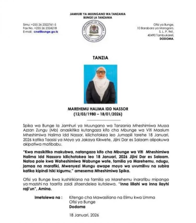 Ati" tubabajwe cyane no gutangaza urupfu rwa Depite Halima Idd Nassor, rwabaye uyu munsi ku wa 18 Mutarama 2026 mu Mujyi wa Dar es Salaam. Turihanganisha ba Nyakubahwa Badepite bose, umuryango wa nyakwigendera, abavandimwe, inshuti n’abandi bose bagize ibyago byo kumubura. Imana ibahe kwihangana n’ihumure muri ibi bihe bikomeye."