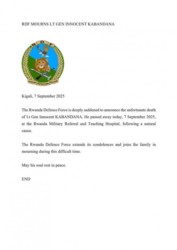 Uongozi wa Jeshi la Rwanda (RDF) umethibitisha kifo cha Luteni Jenerali Kabandana aliyefariki dunia asubuhi ya Jumapili katika Hospitali ya Kijeshi ya Kanombe, alipokuwa akipatiwa matibabu.