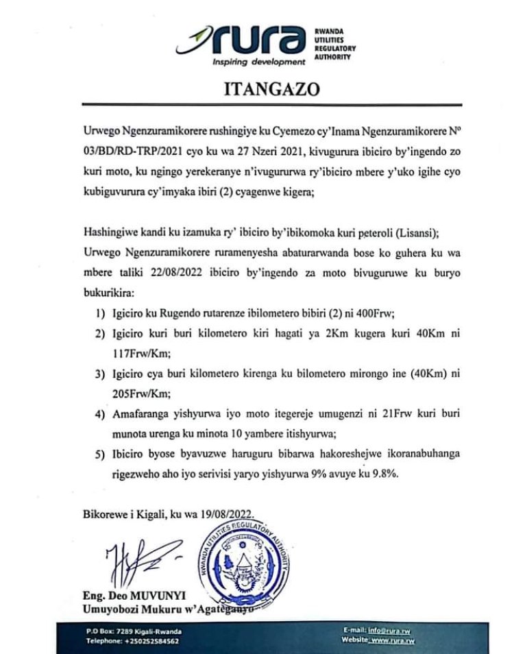 Nkuko Rura yabitangaje mu itangazo yasohoye ku ri uyu wa 19 Kanama 2022 riragaragaza ko ibiciro kubagenzi batega moto byavuguruwe mu buryo bukurikira
