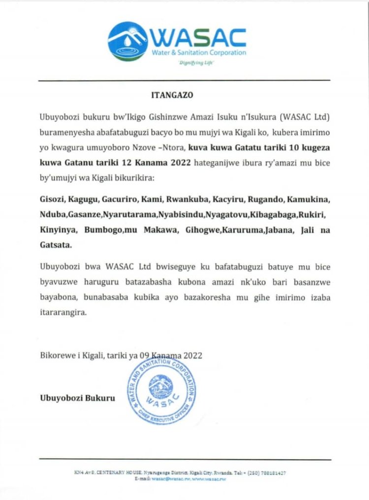 Ikigo (WASAC) gifite mu inshingano Amazi, isuku n'isukura, cyatangarije abatuye muri bimwe mu bice byo mu mujyi wa Kigali, ko kuva kuri uyu wa Gatatu tariki 10 Kanama kugeza kuwa Gatanu tariki 12 Kanama 2022, hari ibice bizaba bidafite amazi.