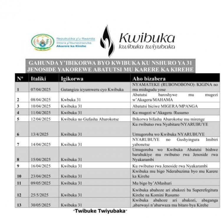 Ni muri urwo rwego Akarere ka Kirehe kashyize hanze amatariki naho ibikorwa byo kwibuka Jenoside yakorewe abatutsi 1994 bizabera.