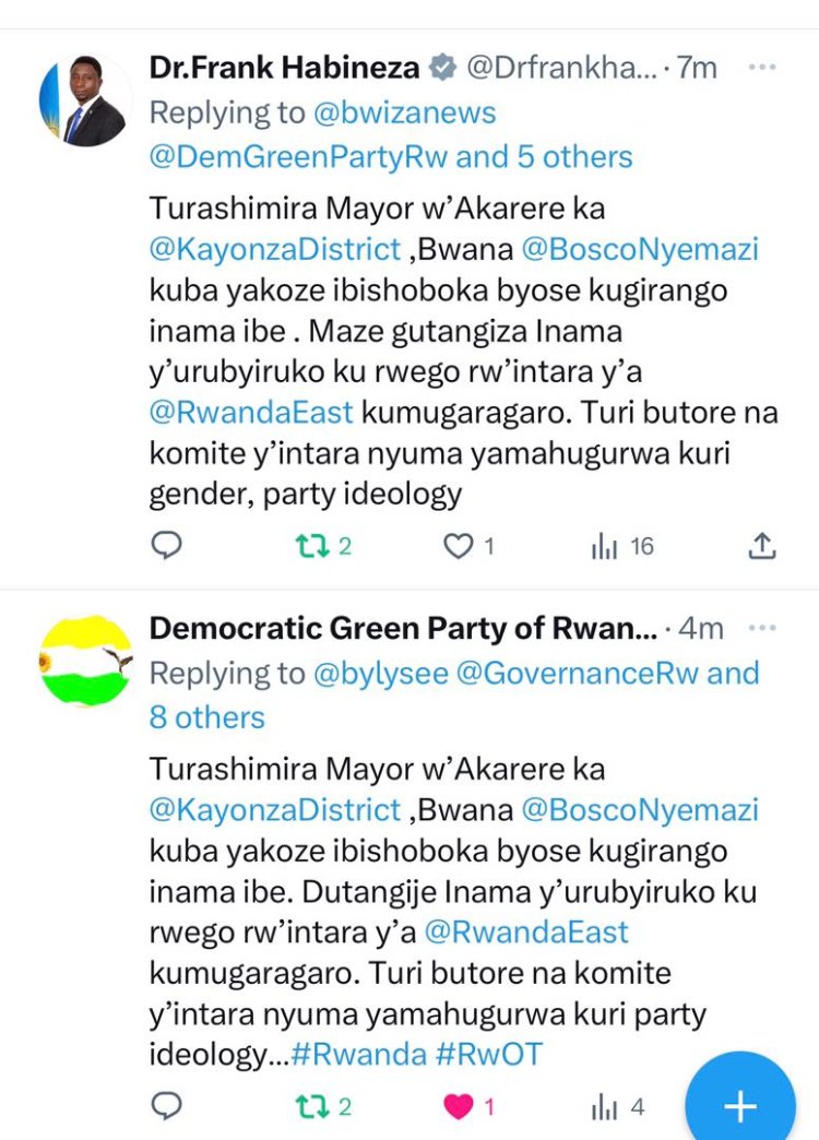 Nyuma y'ubwumvikane Green Party of Rwanda yahise ishimira Umuyobozi w'akarere ka Kayonza nkuko bigaragara kuri Twitter ya DGPR