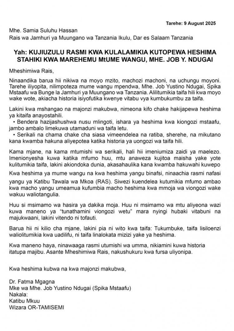 Mke wa aliyekuwa Spika wa Bunge, Job Ndugai, ambaye pia ni Katibu Tawala wa Mkoa wa Singida, Dkt. Fatma Mganga, amekanusha vikali barua inayosambaa mitandaoni ikidai amejiuzulu.