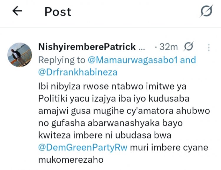 Umwe mu barwanashyaka ba Green Party of Rwanda witwa Nishyirembere Patrick yahise ajya kuri X maze asangiza ubutumwa abamukurikira bugira buti" Ibi nibyiza rwose ntabwo imitwe ya Politiki yacu izajya iba iyo kudusaba amajwi gusa mugihe cy'amatora ahubwo no gufasha abarwanashyaka bayo kwiteza imbere ni ubudasa bwa @DemGreenPartyRw muri imbere cyane mukomerezaho.