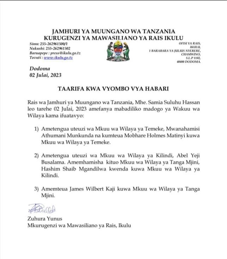 Tariki 2 Nyakanga 2023 Perezida Samia yakoze impinduka mu bayobozi b'Uturere mu buryo bukurikira nkuko itangazo ryaturutse mu biro by'Umukuru w'Igihugu ribigaragaza.