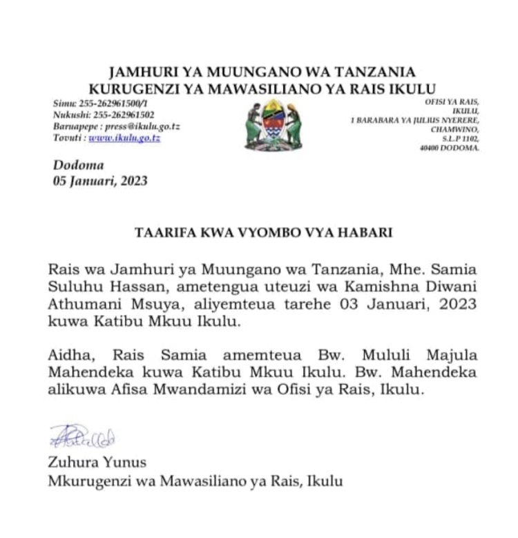 Perezida wa Tanzania Samia Hassan Suluhu hayagaritse ku mirimo umuyobozi yari yashyizeho ku wa kabiri tariki 3 Mutarama 2023