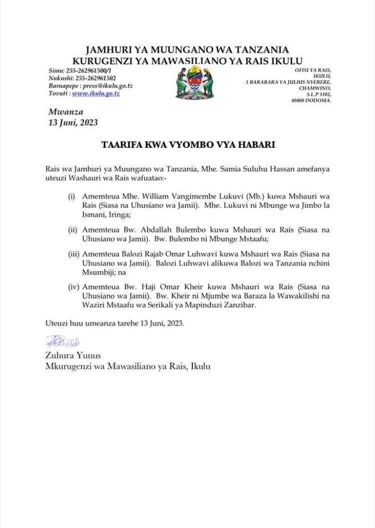 Kuri uyu wa kagatatu tariki ya 14 Kamena 2023 Perezida wa Tanzania Hassan Samia Suluhu yakoze impinduka mu bajyanama be