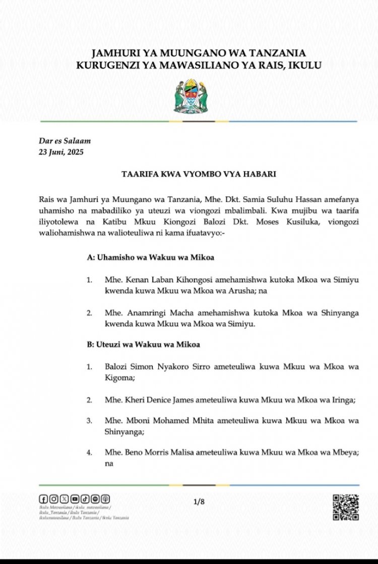 Kuri uyu wambere tariki ya 23 Kamena 2025, Perezida wa Tanzania Samia Hassan Suluhu yakoze impundu ka mu nzego zitandukanye aho Paul Makonda wari Umuyobozi w'intara ya Arusha yasimbuwe na Kenan Laban Kihongosi.