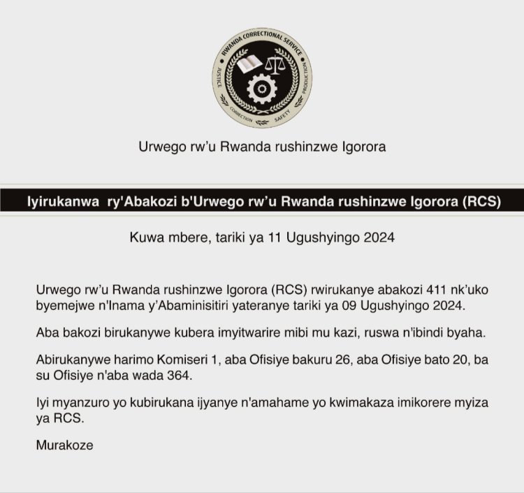 Urwego rw'Igihugu rushinzwe igorora RCS rwatangaje ko rwirukanye abakozi barwo 411 kubera imyitwarire mibi mu kazi, irimo ruswa n'ibindi byaha.