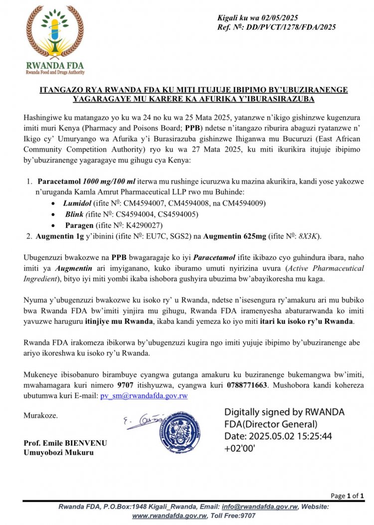 Rwanda FDA iramenyesha ko imiti ikurikira itujuje ibipimo by’ubuziranenge yagaragaye mu Karere ka Afurika y’Iburasirazuba, itigeze yinjira mu gihugu, bityo ikaba itari ku isoko ry’u Rwanda.