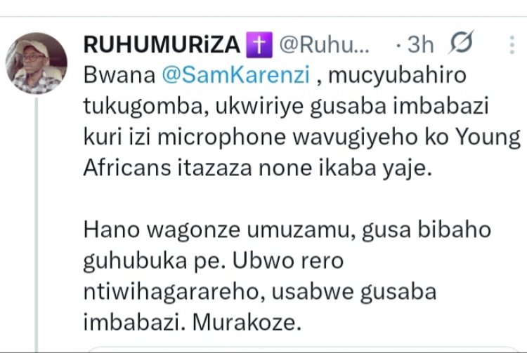Umunyamakuru Sam Karenzi akaba na nyiri Radio SK fm, yasubije uwitwa Ruhumuriza kuri X wari banditse ubutumwa asaba Samu karenzi gusaba imbabazi biturutse ku magambo yari yavugiye ku kiganiro kitwa Urukiko rw'ikirenga rw'imikino. Ruhumurizza yagize ati" Bwana @SamKarenzi , mucyubahiro tukugomba, ukwiriye gusaba imbabazi kuri izi microphone wavugiyeho ko Young Africans itazaza none ikaba yaje. Hano wagonze umuzamu, gusa bibaho guhubuka pe. Ubwo rero ntiwihagarareho, usabwe gusaba imbabazi. Murakoze.