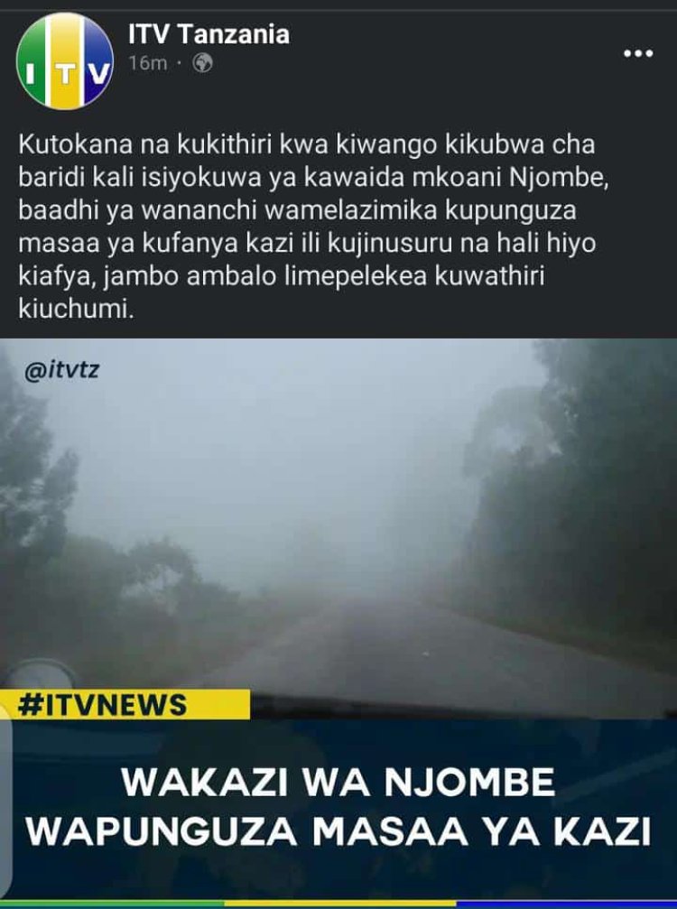 Nkuko tubikesha ikinyamakuru ITV, ngo mu Ntara ya Njombe hadutse ubukonje budasanzwe kandi bukabije kuburyo abakozi batangiye kugabanya amasaha y'akazi mu rwego rwo kurengera ubuzima bwabo.