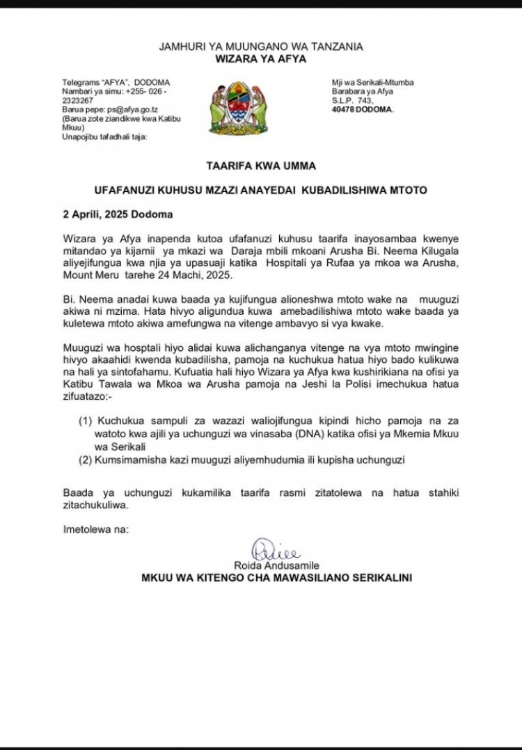 Amakuru aravuga ko umubyeyi witwa Neema Kilugala uri mu kigero kimyaka 26 utuye mu ntara ya Arusha , yatangarije bimwe mu binyamakuru byo muri Tanzania, ko yabyaye tariki ya 24 Werurwe 2025, akabyara umwana w'umukobwa umeze neza hanyuma ngo yaje gutungurwa no kubona bamuzaniye urundi ruhinja narwo rw'umukobwa ariko rugaragara ko rufite ibibazo by'ubuzima ku buryo rwamaze agihe gito rugahita rwitaba Imana.