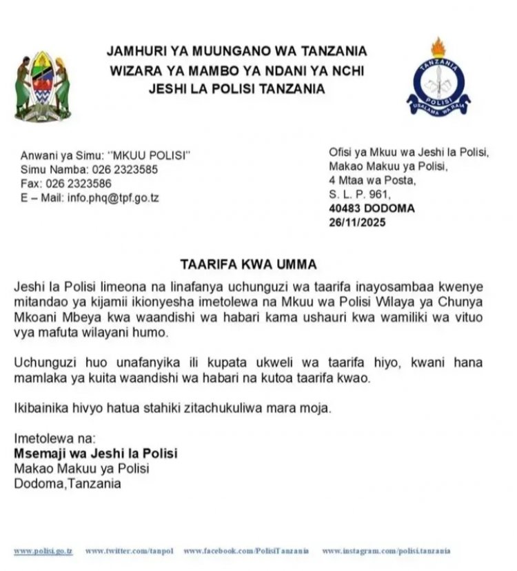 Polisi ya Tanzania yavuze ko yatangiye iperereza ngo hamenyekane impamvu umuyobozi wa Polisi mu karere ka Cyunya mu ntara ya Mbeya, yihaye ububasha bwo gukoresha ikiganiro n'itangazamakuru maze agatanga itegeko ko mu rwego rwokwirinda ko hari urubyiruko ruzakoresha Moto mu myigaragambyo iteganyijwe tariki ya 9 Ukuboza 2025, Sitasiyo za lisanze zitemerewe kurenza litiro ebyiri za lisanze ku mumotari.