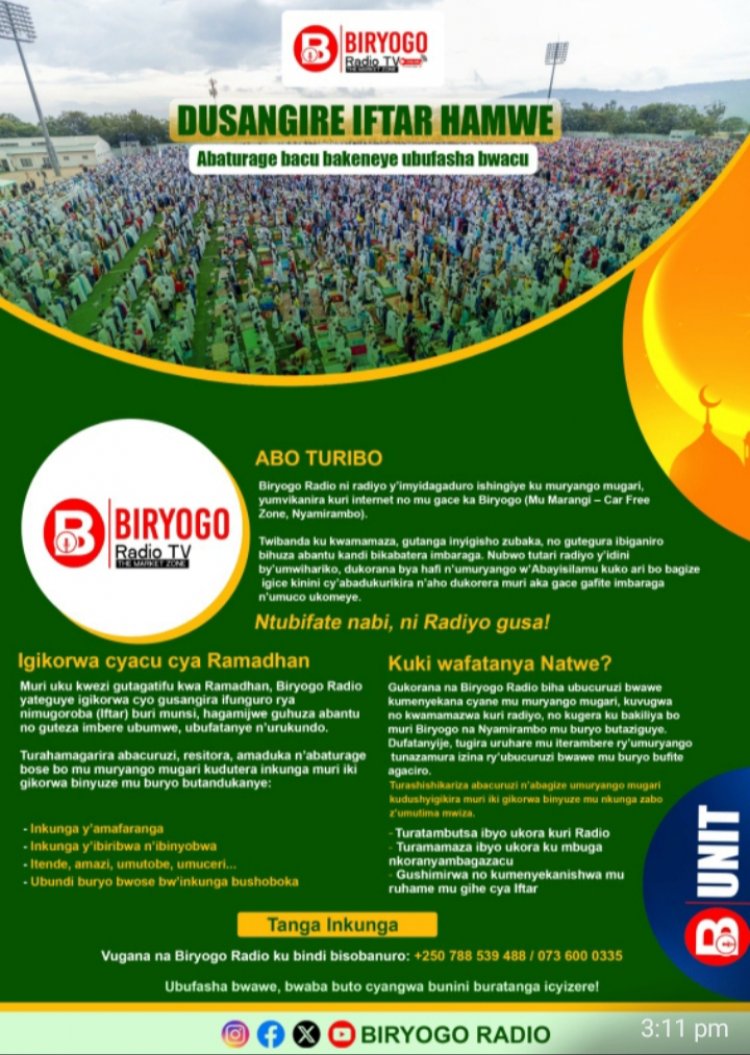 Ku nshuro ya mbere dutumiye buri wese wifitemo impano yaba iyo guteka cyangwa kurya ndetse nukunda art ya food, ko kuwa gatanu saa tatu nyuma yisengesho rya Eid hano muri Biryogo Car free zone ahari icyicaro cya Biryogo Radio TV.